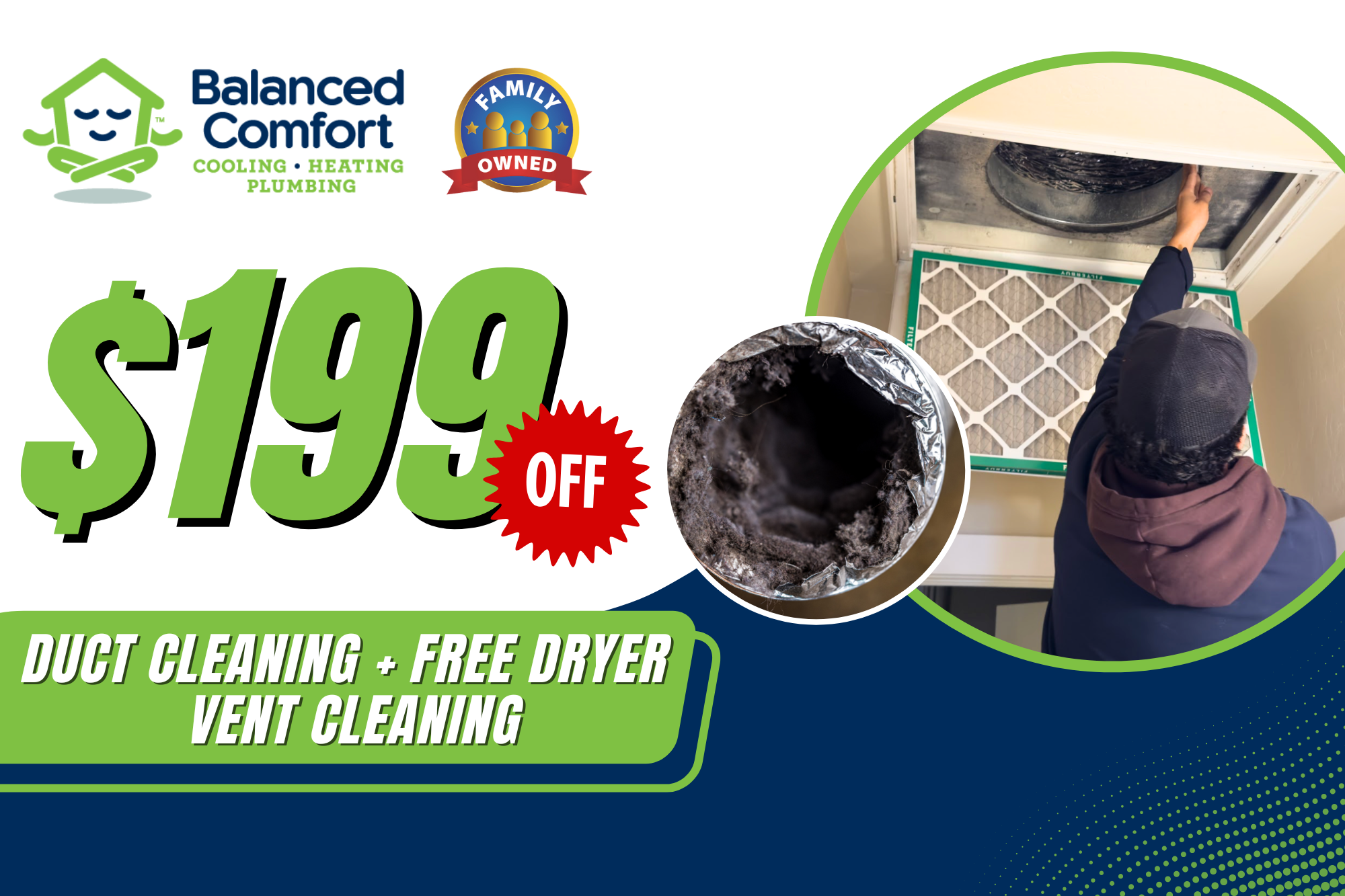Breathe cleaner, fresher air! Schedule your duct cleaning today and enjoy a free dryer vent cleaning for just $199!